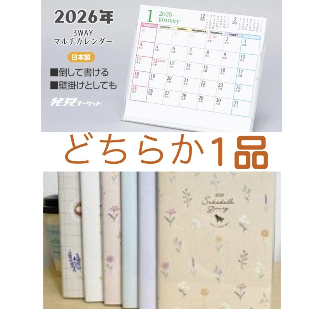 上記期間中、商品お買い上げ¥4400以上で手帳かカレンダープレゼント!